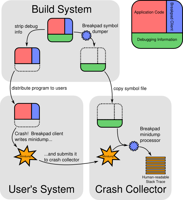 Breakpad is a library and tool suite that allows you to distribute an application to users with compiler-provided debugging information removed, record crashes in compact "minidump" files, send them back to your server, and produce C and C++ stack traces from these minidumps. Breakpad can also write minidumps on request for programs that have not crashed.